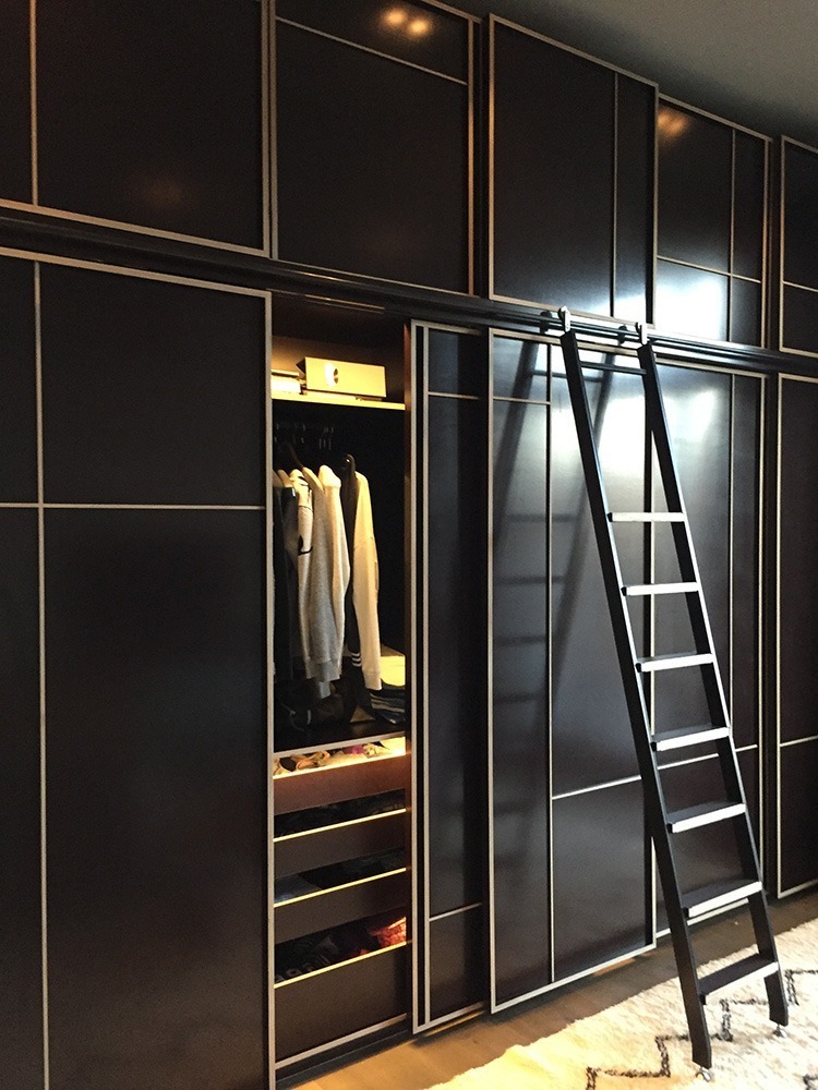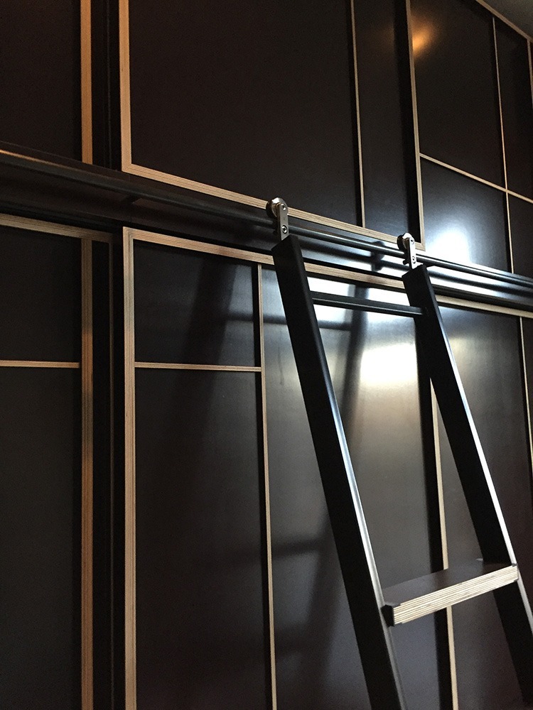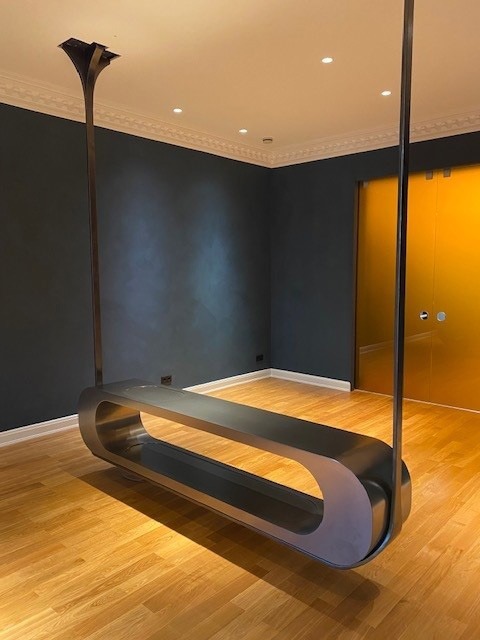 3.5 metre floating table, concrete kitchen worktop. Sideboard, doors and wall-mounted shelves veneered with walnut.