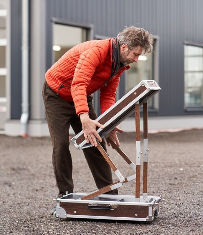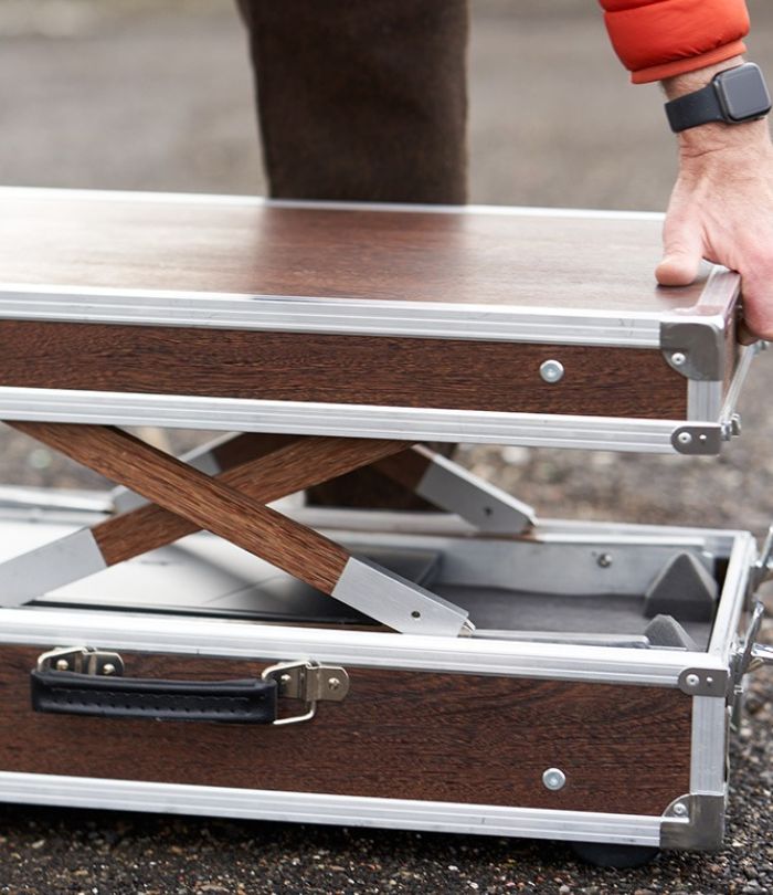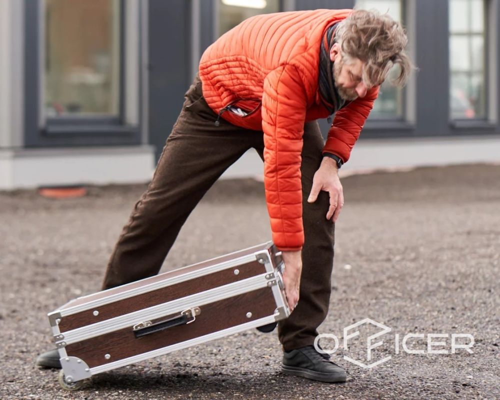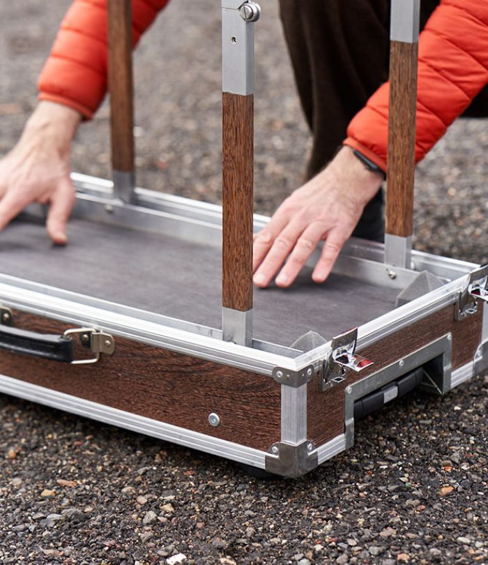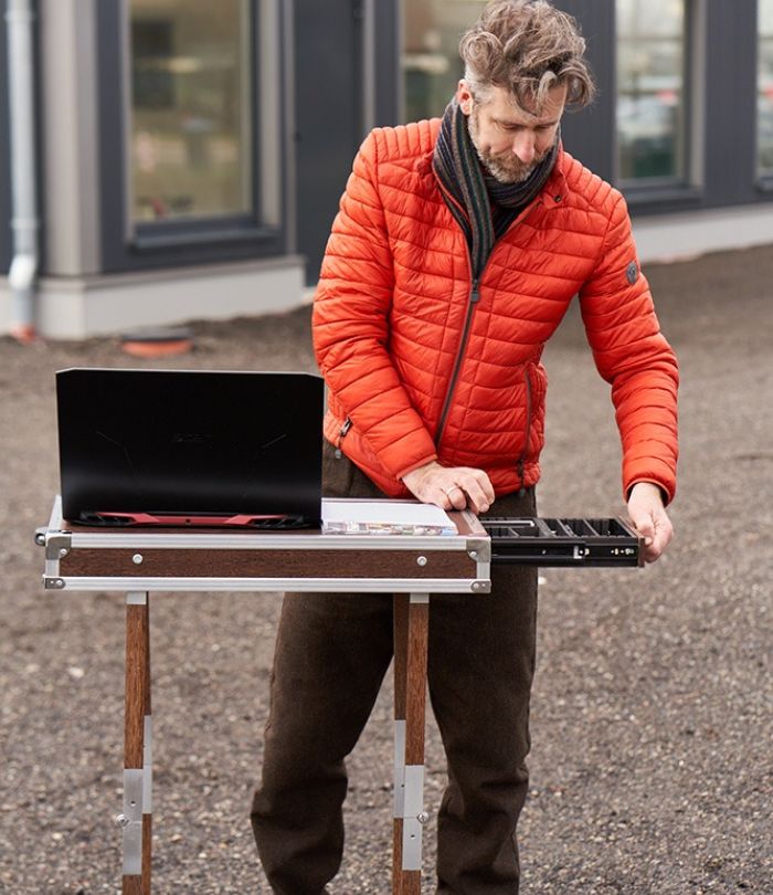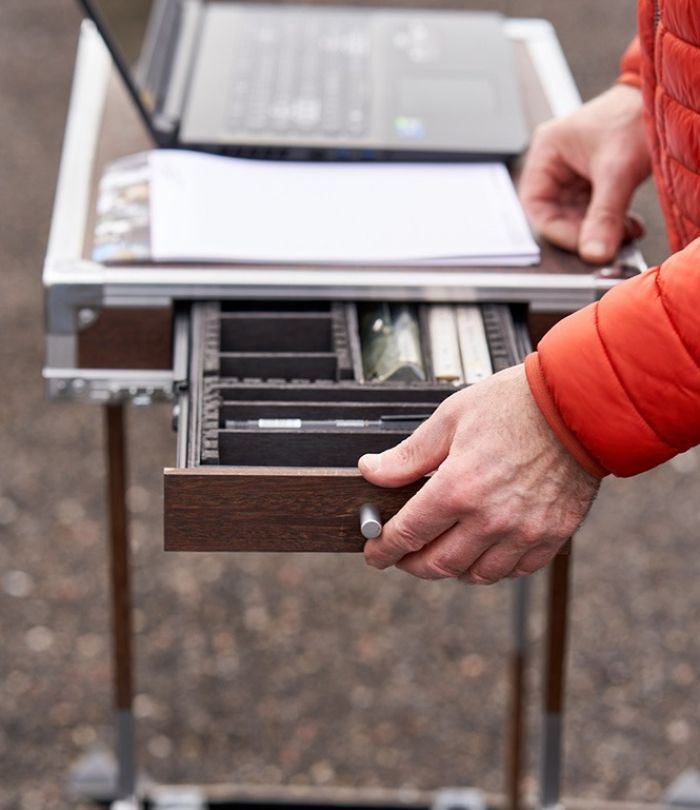The Officer is an innovative, mobile office in a handy format. Thanks to its castors and extendable handle, it can be transported effortlessly like a trolley case. With a simple movement of the hand, the top shell of the case can be transformed into a practical standing desk without the need for screws. The integrated material drawer in the upper section provides additional storage space, while the lower section offers space for notebooks and other equipment.