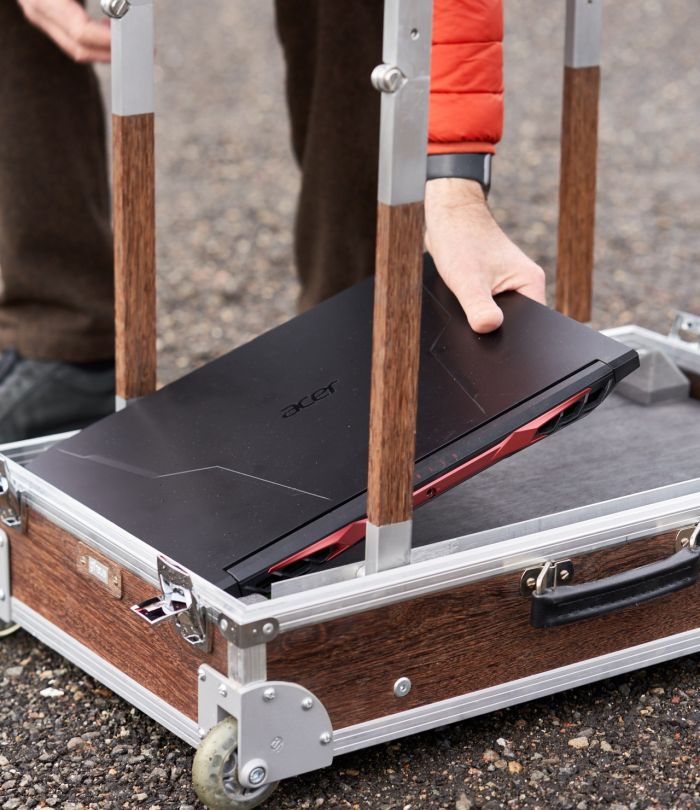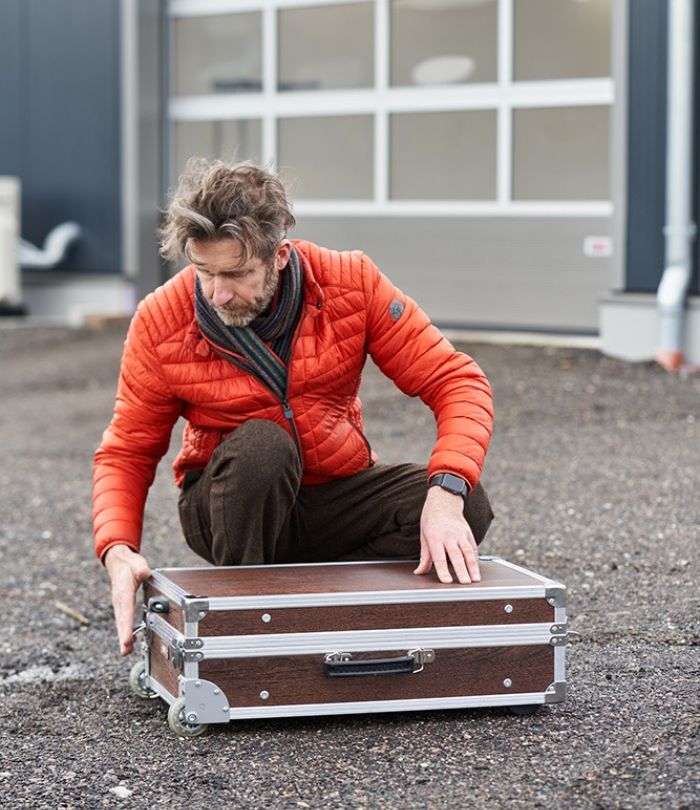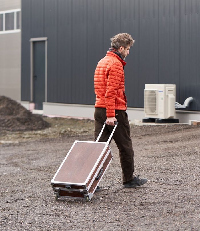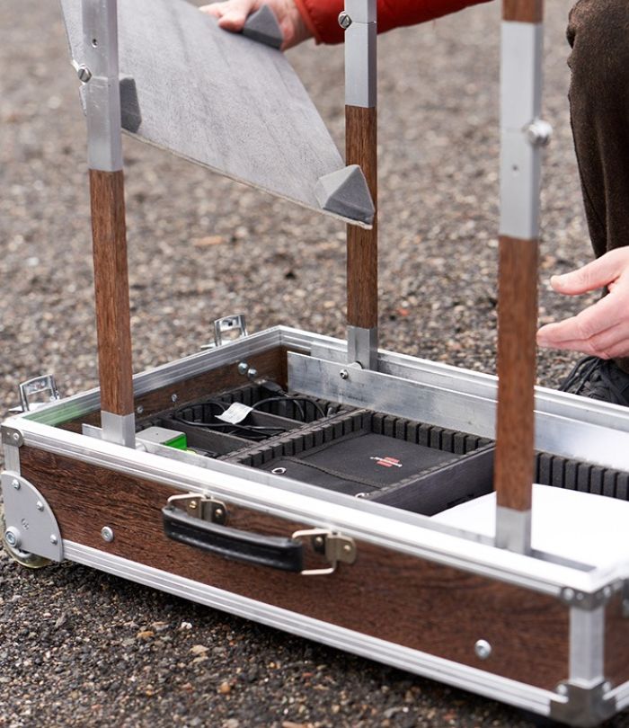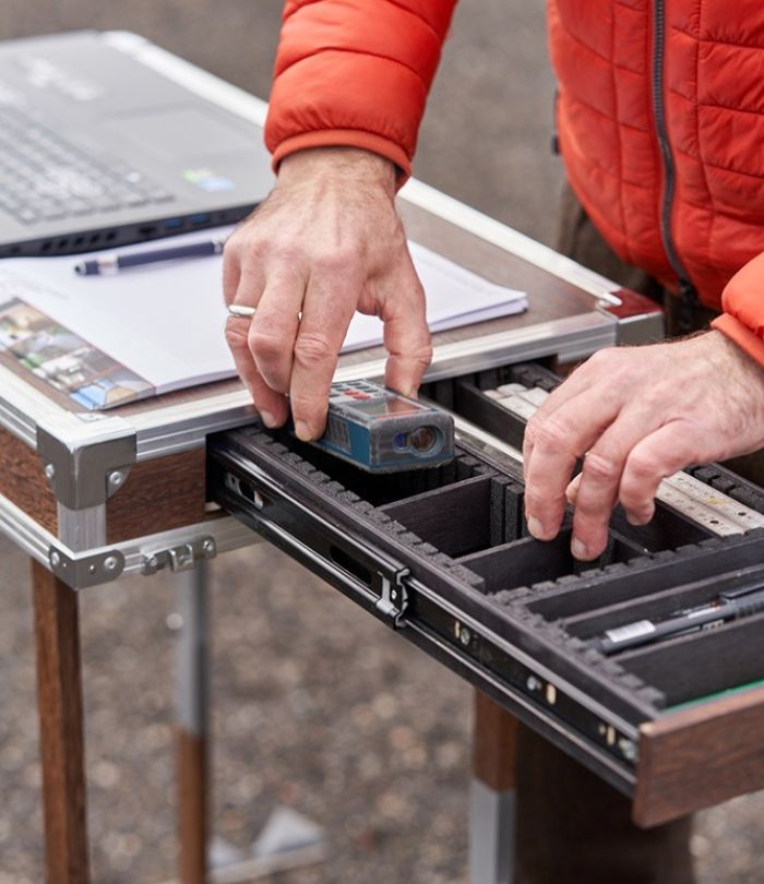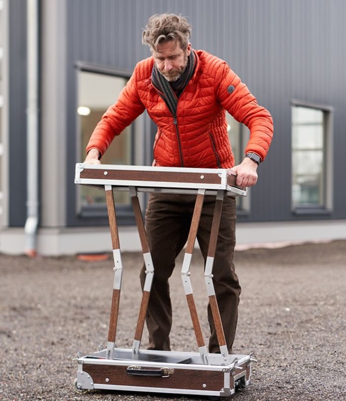 The Officer is an innovative, mobile office in a handy format. Thanks to its castors and extendable handle, it can be transported effortlessly like a trolley case. With a simple movement of the hand, the top shell of the case can be transformed into a practical standing desk without the need for screws. The integrated material drawer in the upper section provides additional storage space, while the lower section offers space for notebooks and other equipment.