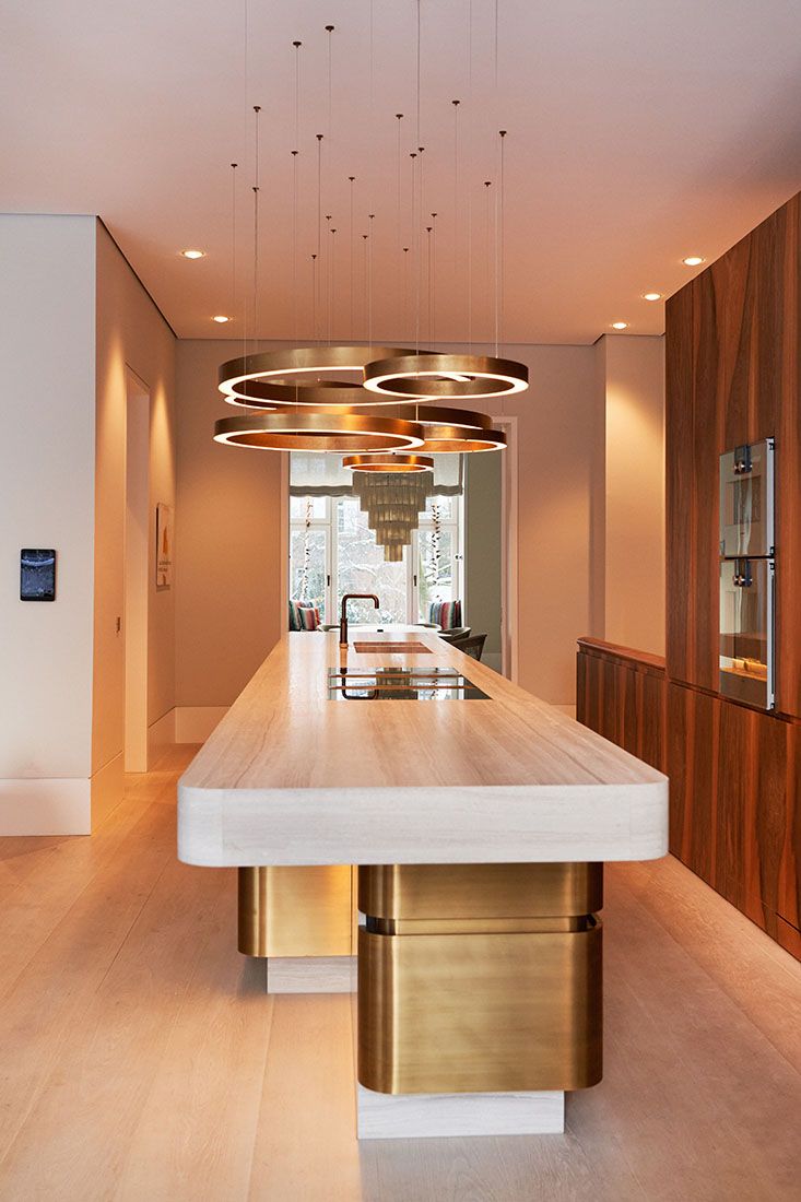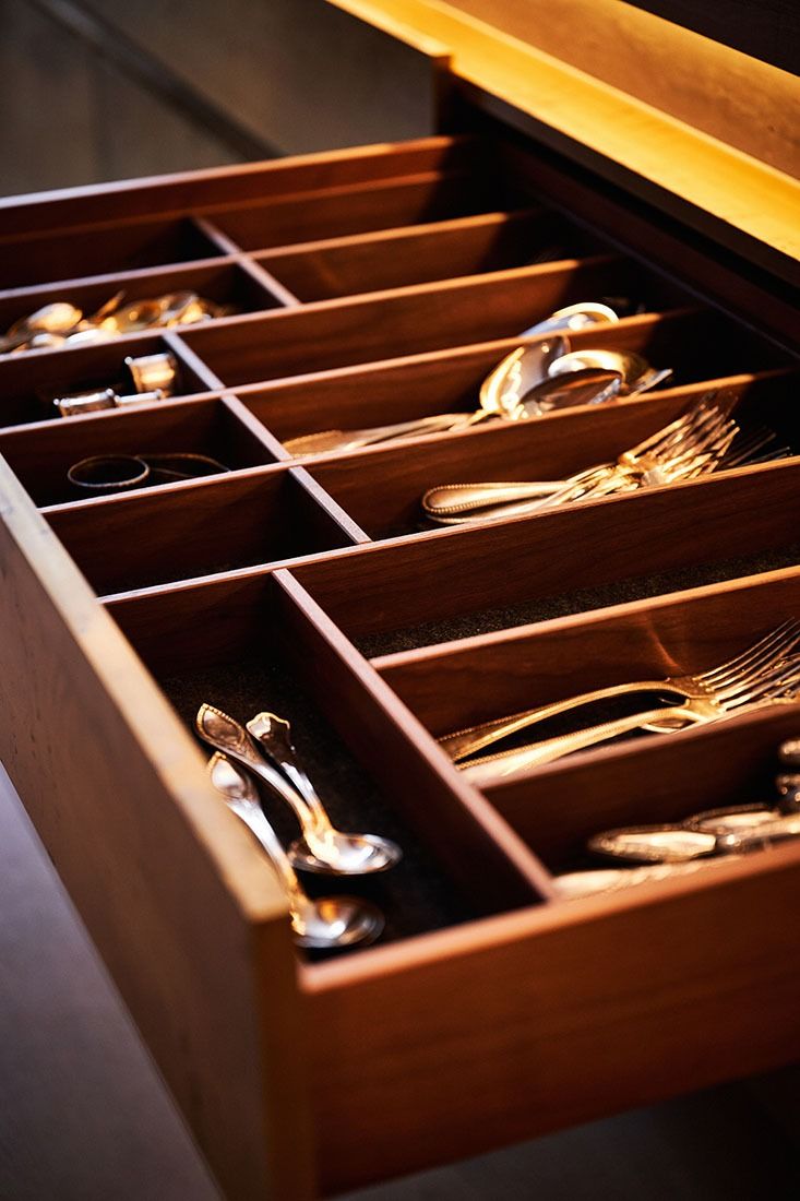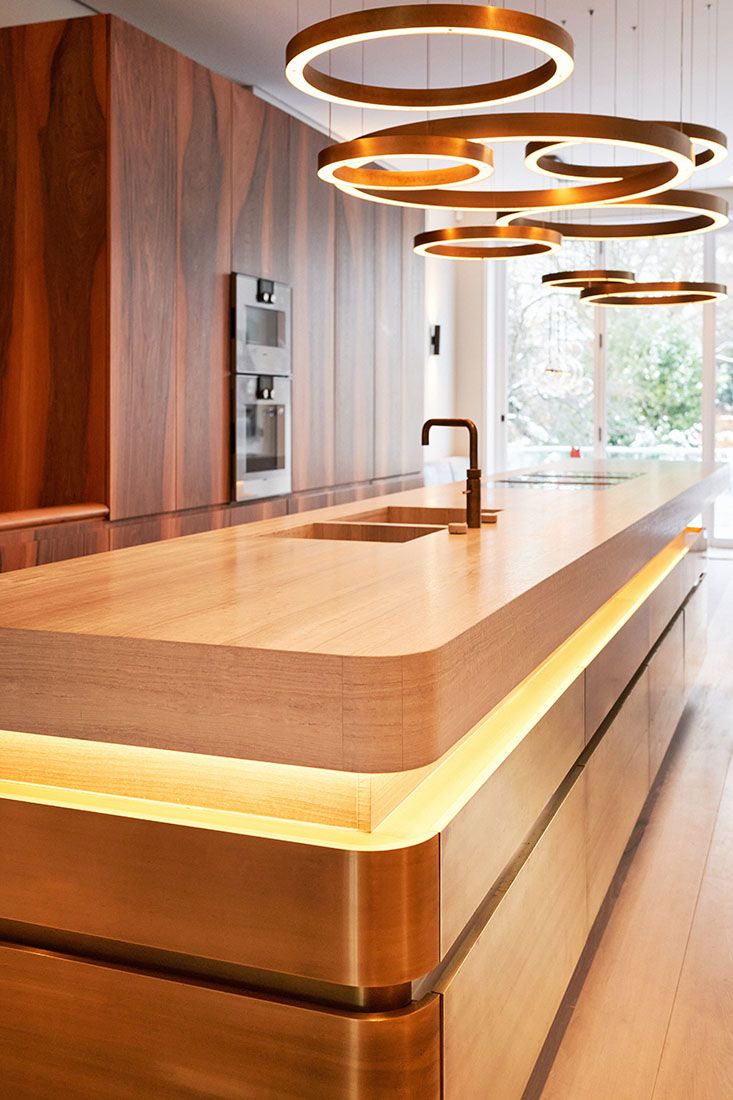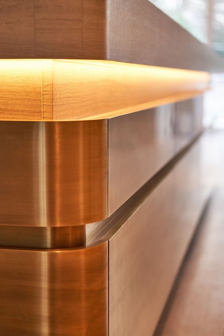 Tresen aus schwarzer Dekorspanplatte mit Messingblech belegt, geschliffen und brüniert. Schubkästen europäischer Nussbaum, Arbeitsplatte Naturstein.