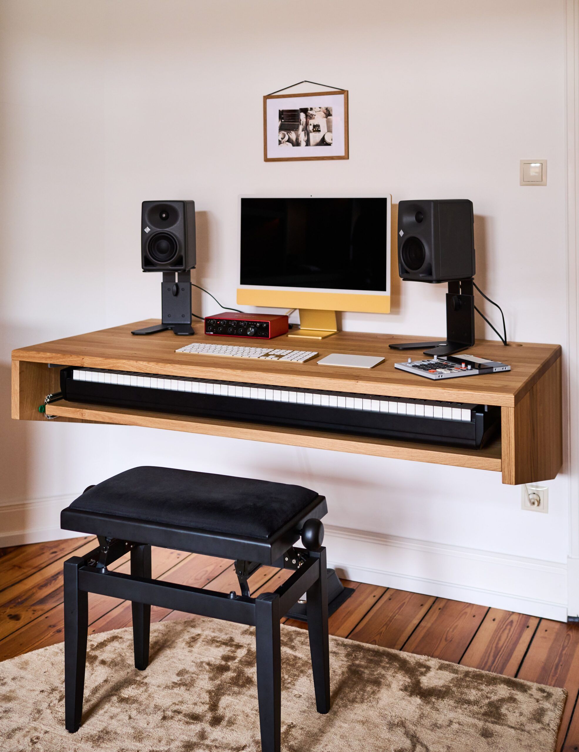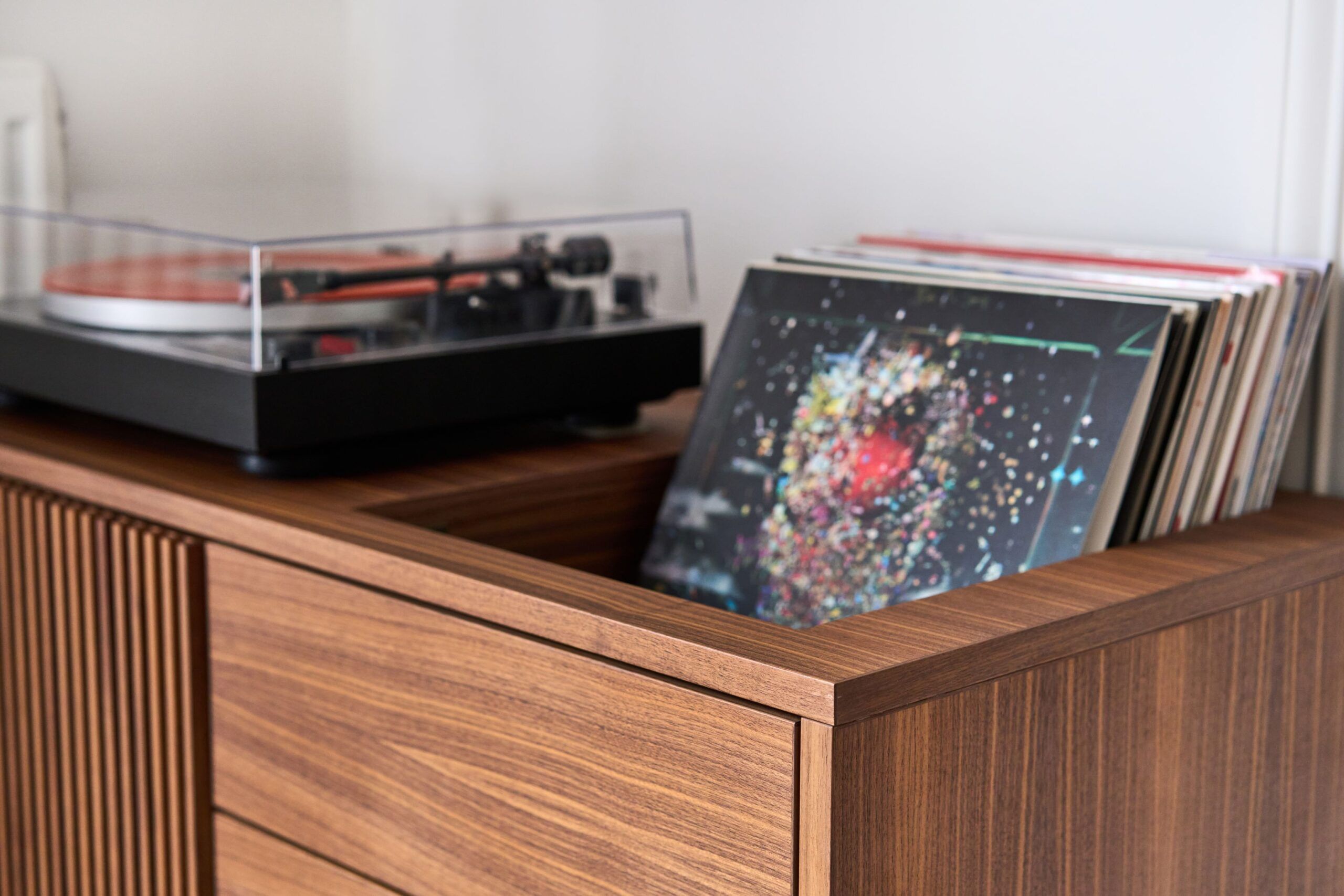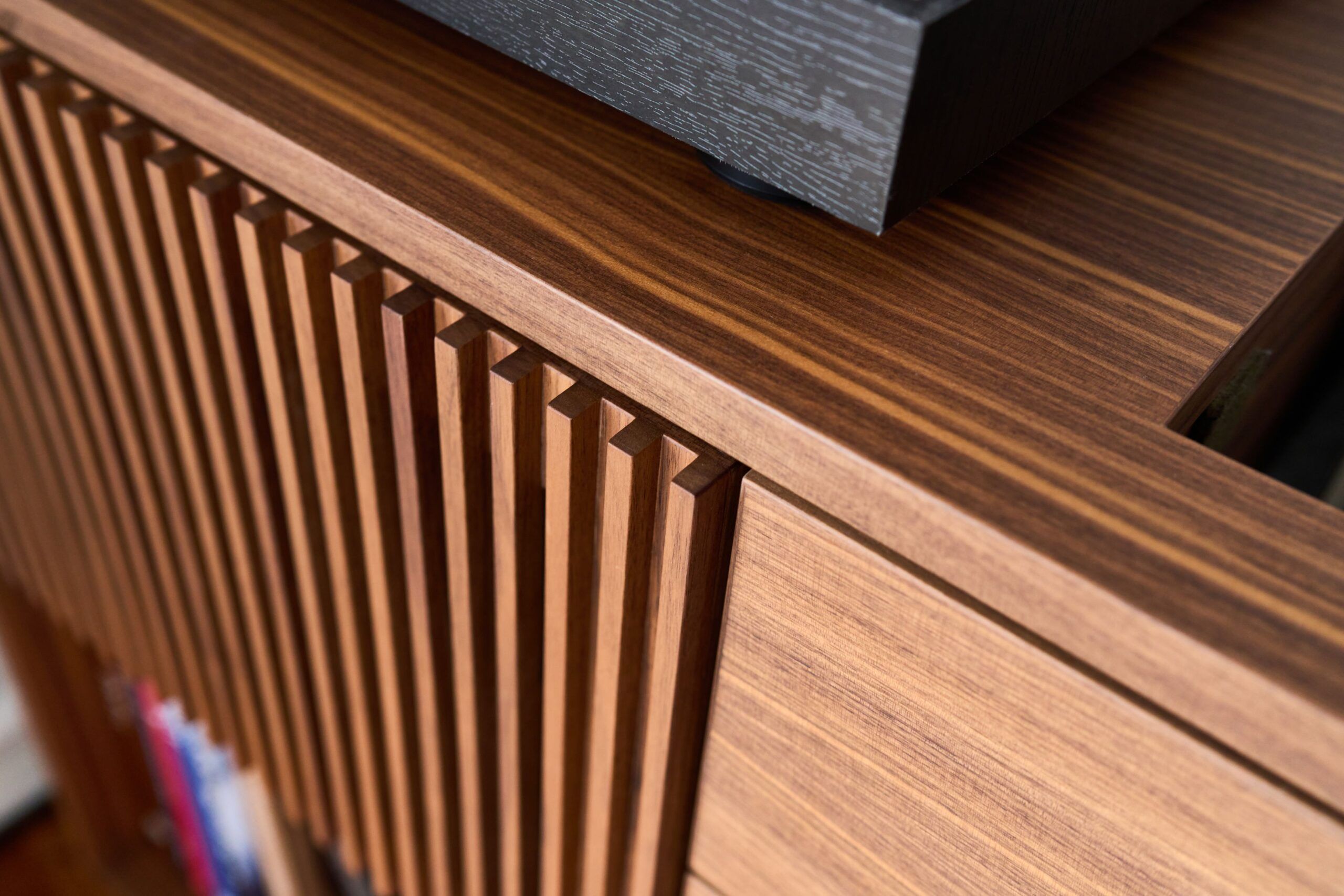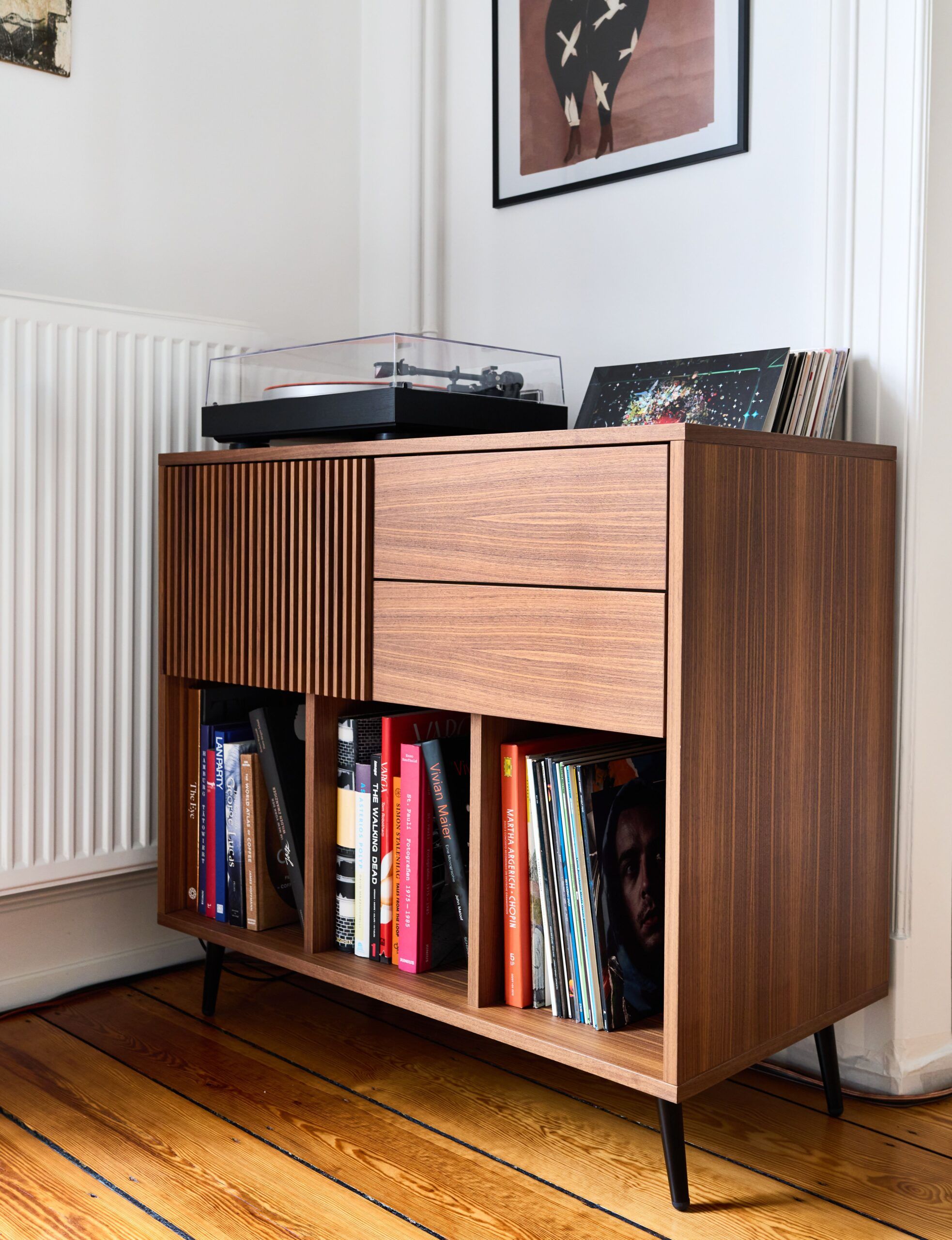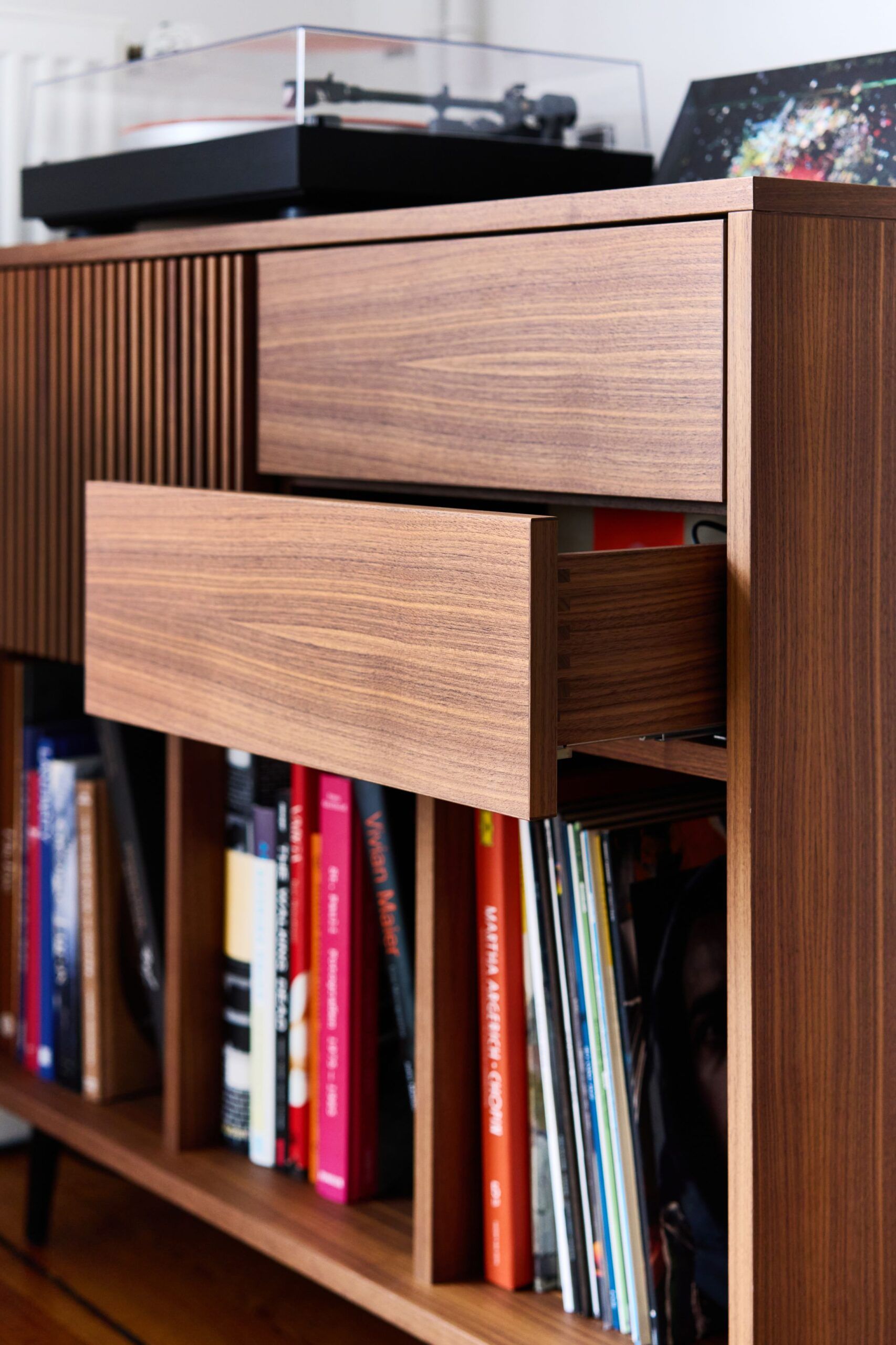 Sideboard für Plattenspieler, Schallplatten mit integriertem Lautsprecher. Nussbaum massiv, geölt. Schreibtisch mit integriertem E-Piano. Bücherschrank Nussbaum. Schlafzimmerschrank MDF weiß lackiert