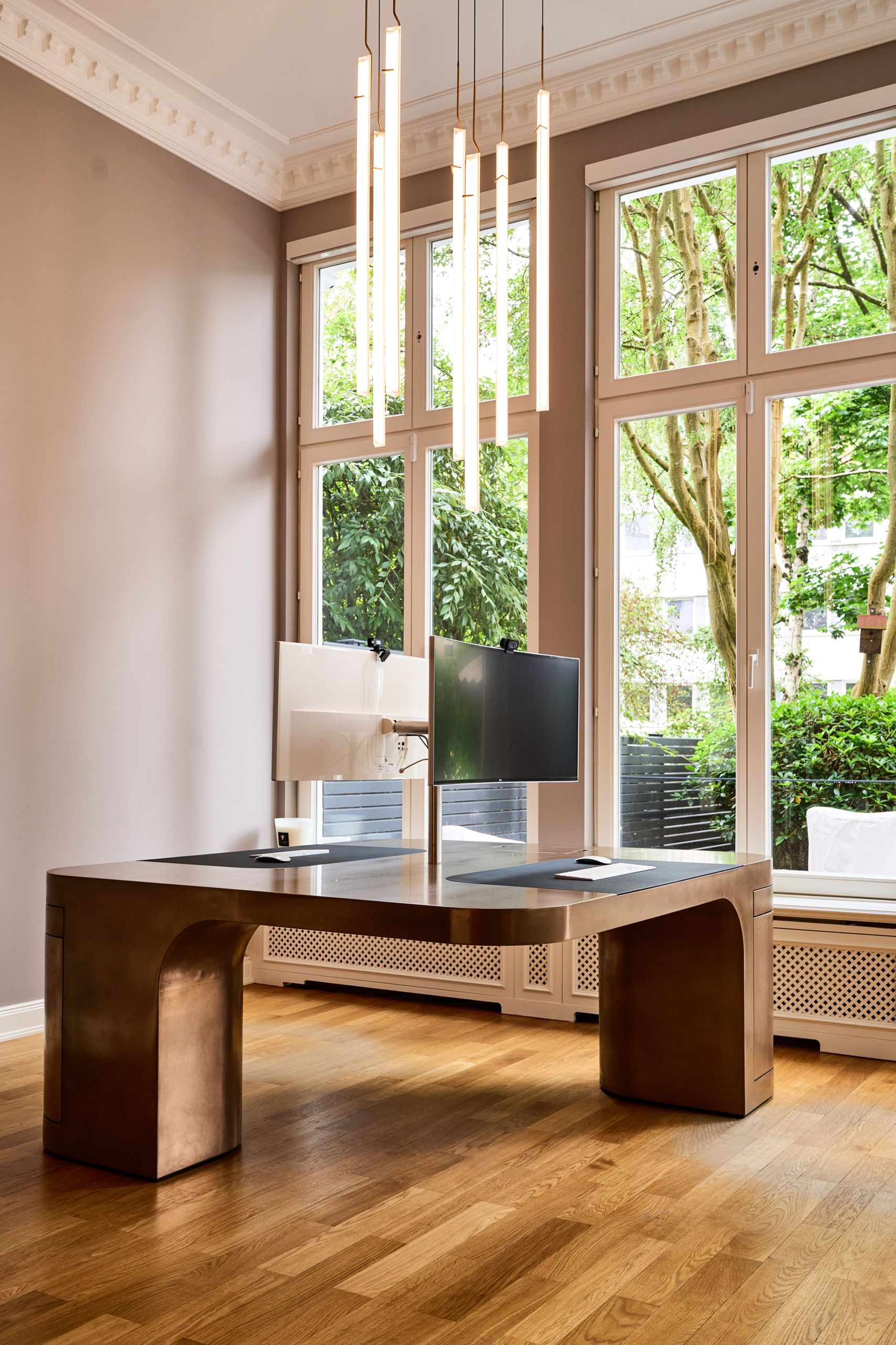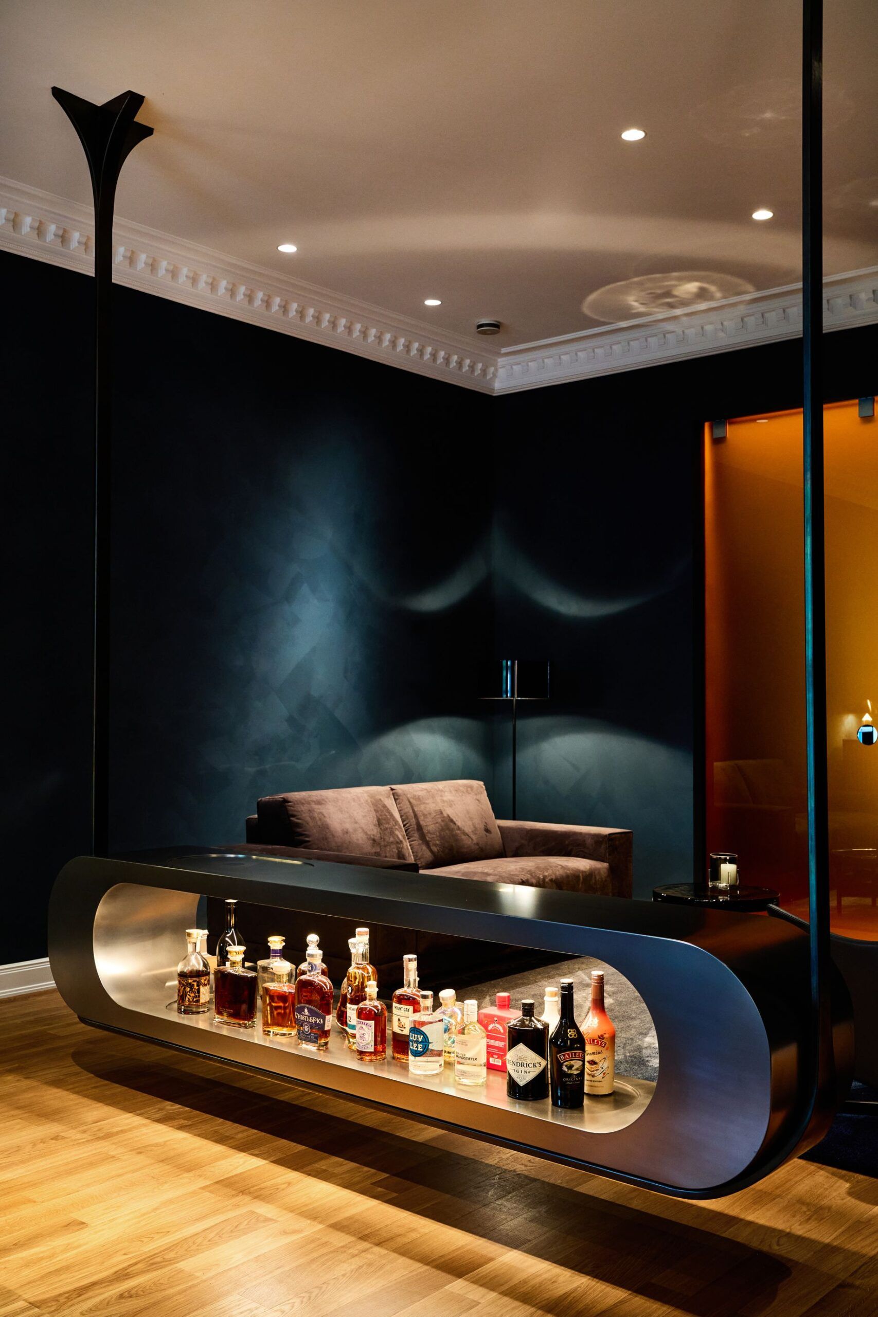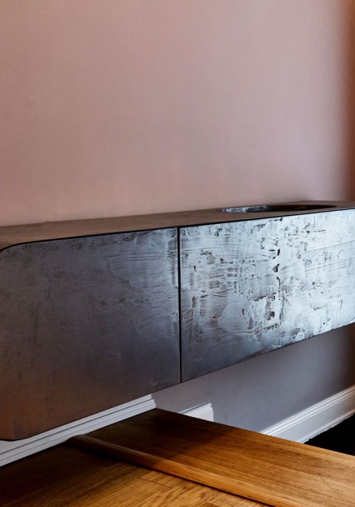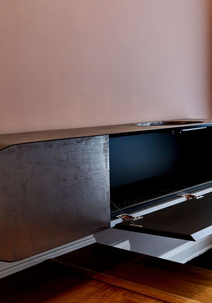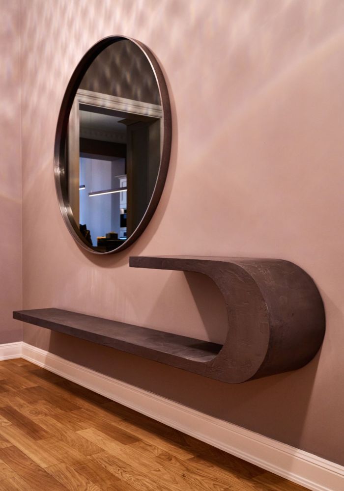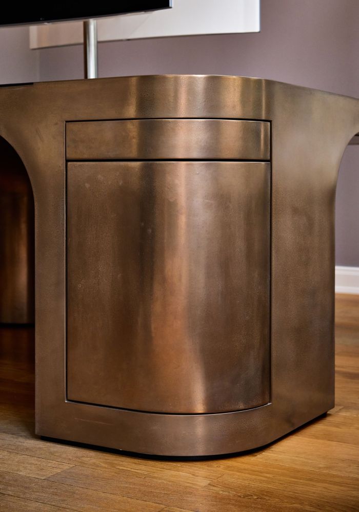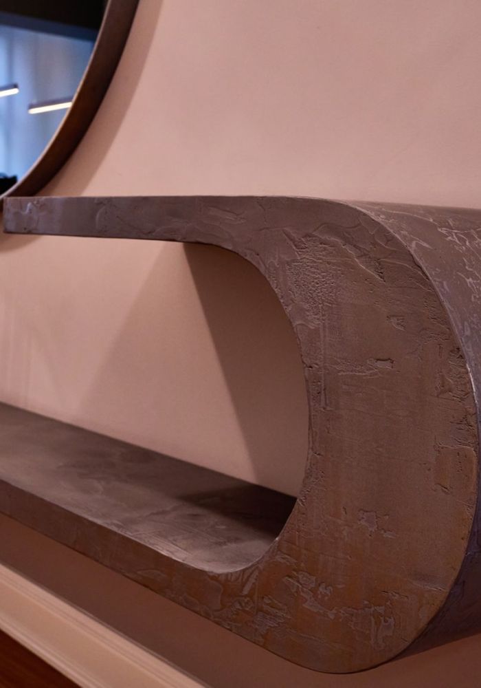 Dieverse Einzelstücke: Schreibtsich für Zwei, MDF, Oberfläche metallbeschichtet. Regal mit seitlichen Rundungen, Garderobe mit Spiegel, schwebende Bar, Schreibtisch, Sideboard, Bettkopfteil