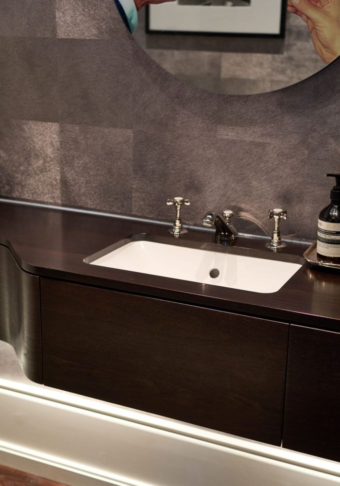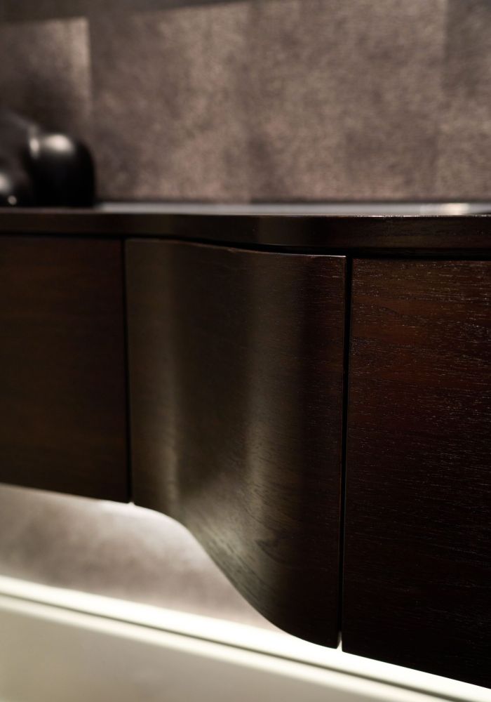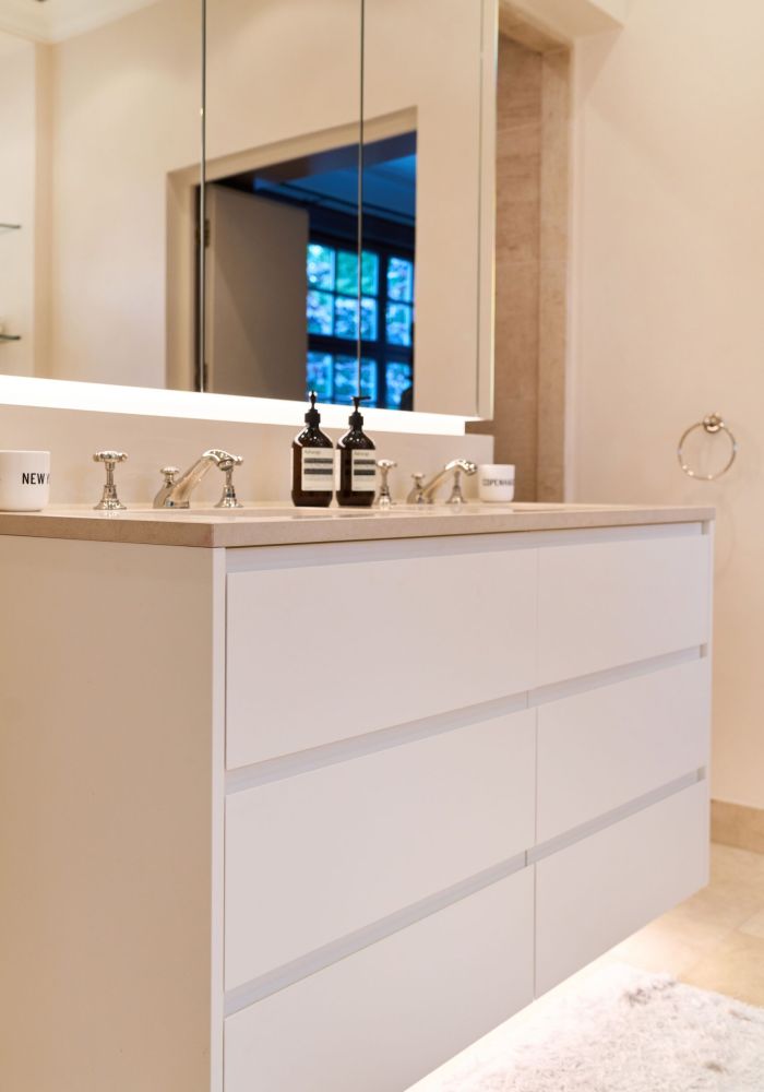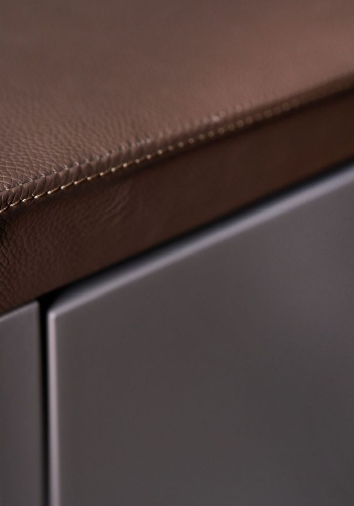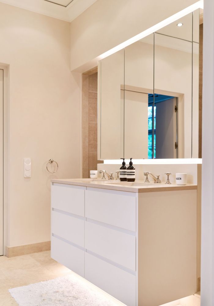 Mittelblock für Ankleide, MDF lackiert, Deckel mit Leder bezogen. Waschtisch Gäste-WC, Eiche gebeizt und lackiert. Waschtisch Master Bad MDF lackiert, Spiegelschrank mit umlaufender LED-Beleuchtung.