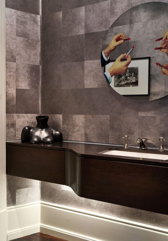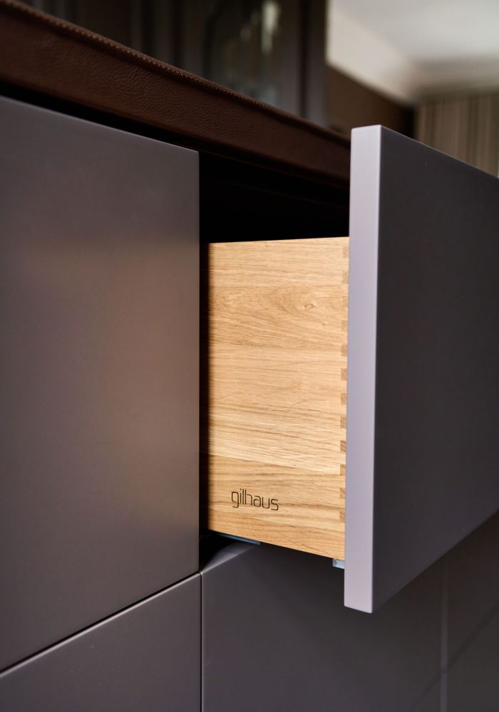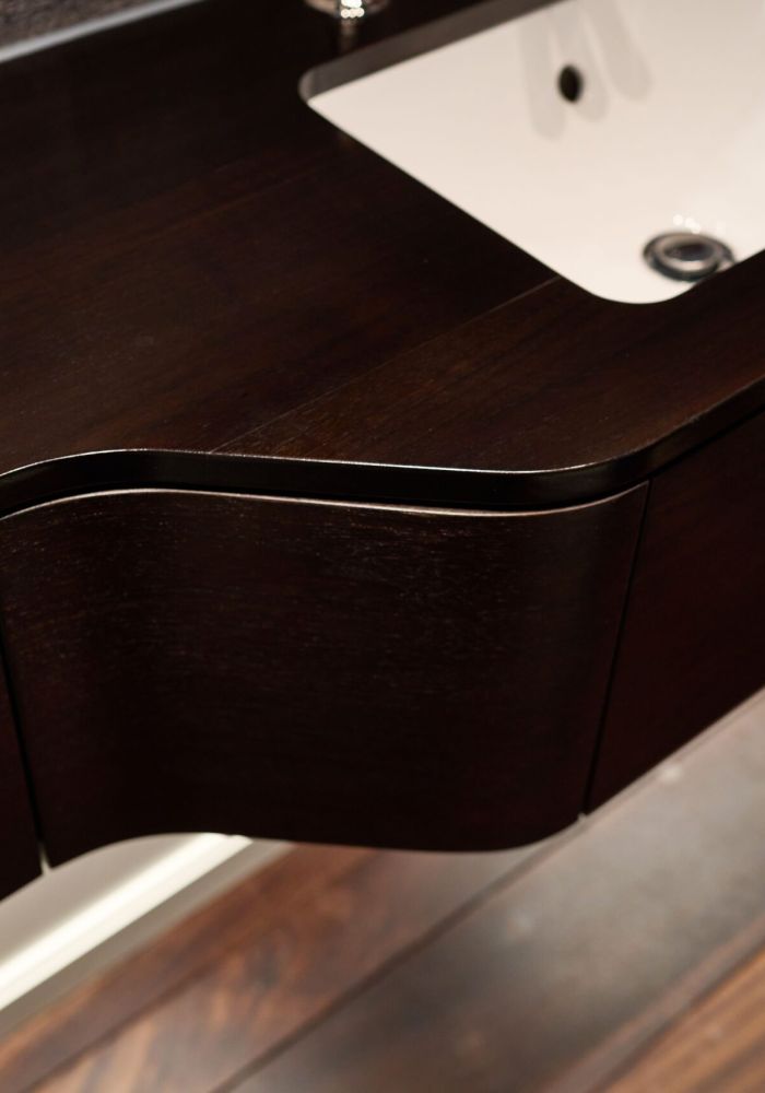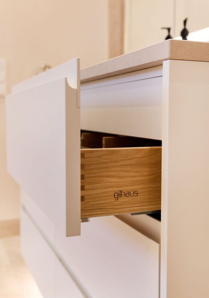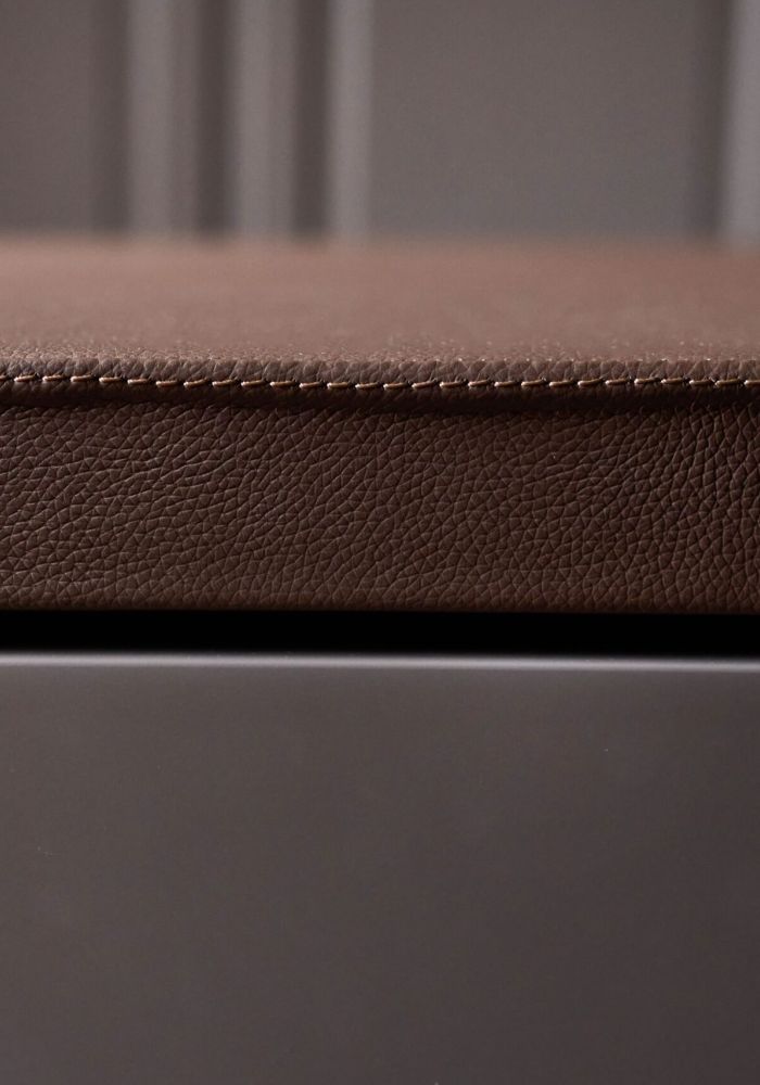 Mittelblock für Ankleide, MDF lackiert, Deckel mit Leder bezogen. Waschtisch Gäste-WC, Eiche gebeizt und lackiert. Waschtisch Master Bad MDF lackiert, Spiegelschrank mit umlaufender LED-Beleuchtung.