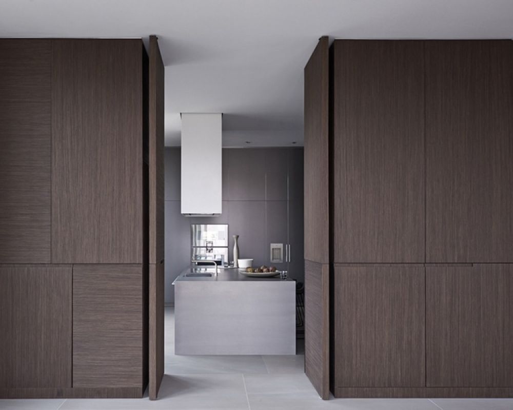 Raumhohe Schiebetüren und Pivot Türen, Wandverkleidungen mit integrierten Schränken und geprägtem dunklem Furnier. Raumhohe Regale aus lackiertem MDF, Badezimmermöbel und Garderobe.